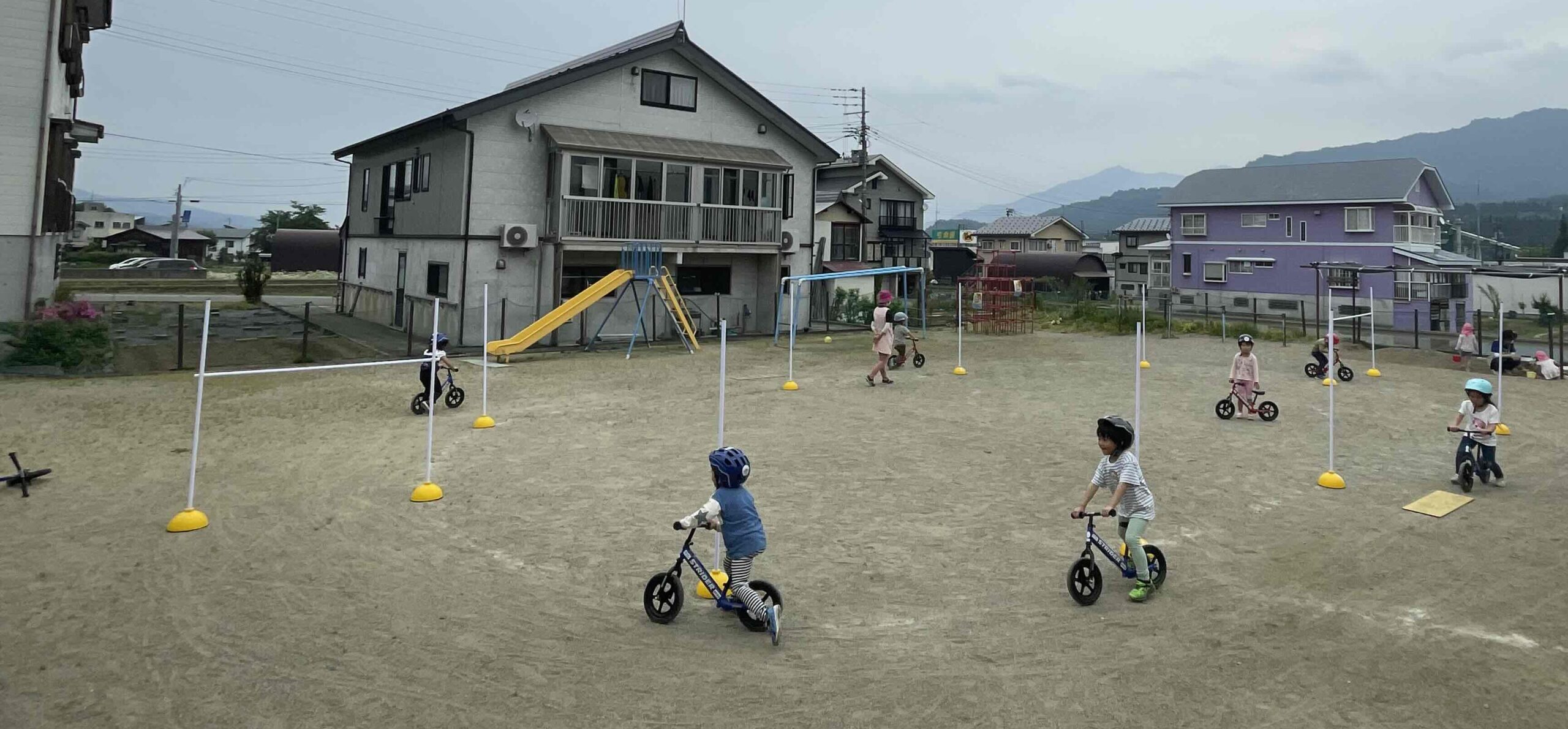 巡回教室:市内の保育園に出張して、ストライダー教室を行っています。また、保育園にストライダーの貸出も行い、子どもたちが身体を動かすきっかけになるよう取り組んでいます。